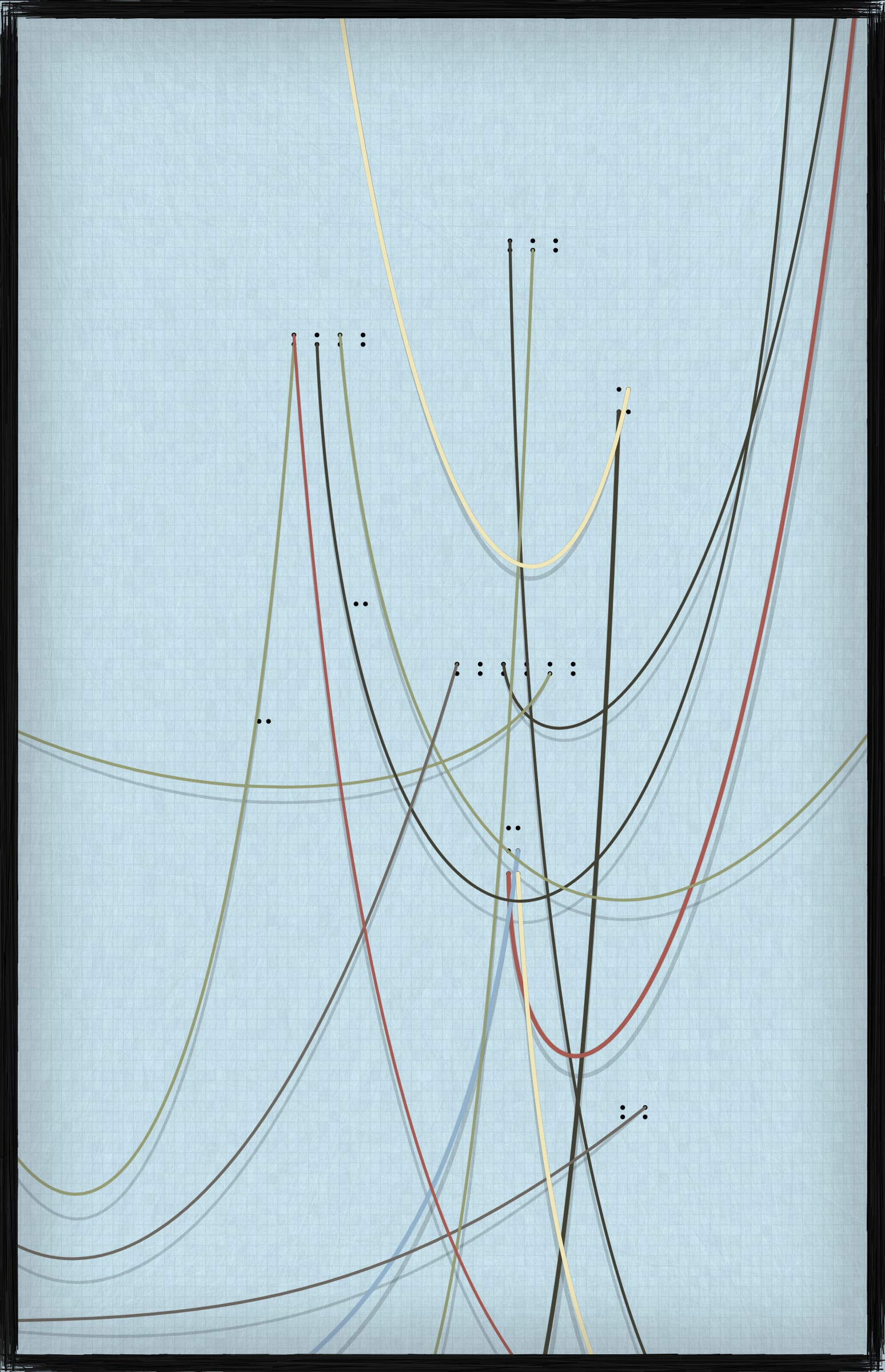 A work around the feeling of being stuck or trapped. This feeling has led me through cycles of frustration, depression and anger. When I find myself stuck in my head, it's as if I am running around in circles, falling in similar patterns. While the pieces may initially appear peaceful, natural, and flowing, each artwork includes at least one shape trying to break free from its confinement but not succeeding. This contrast highlights the struggle between the desire for freedom and the reality of both real and perceived limitations. Technically, the work is created by selecting Fibonacci sequenced or random points within a confined space after which the Delaunay triangulation algorithm is used to separate them, from that point we apply a lot of different parameters to each separated area to create the final work.